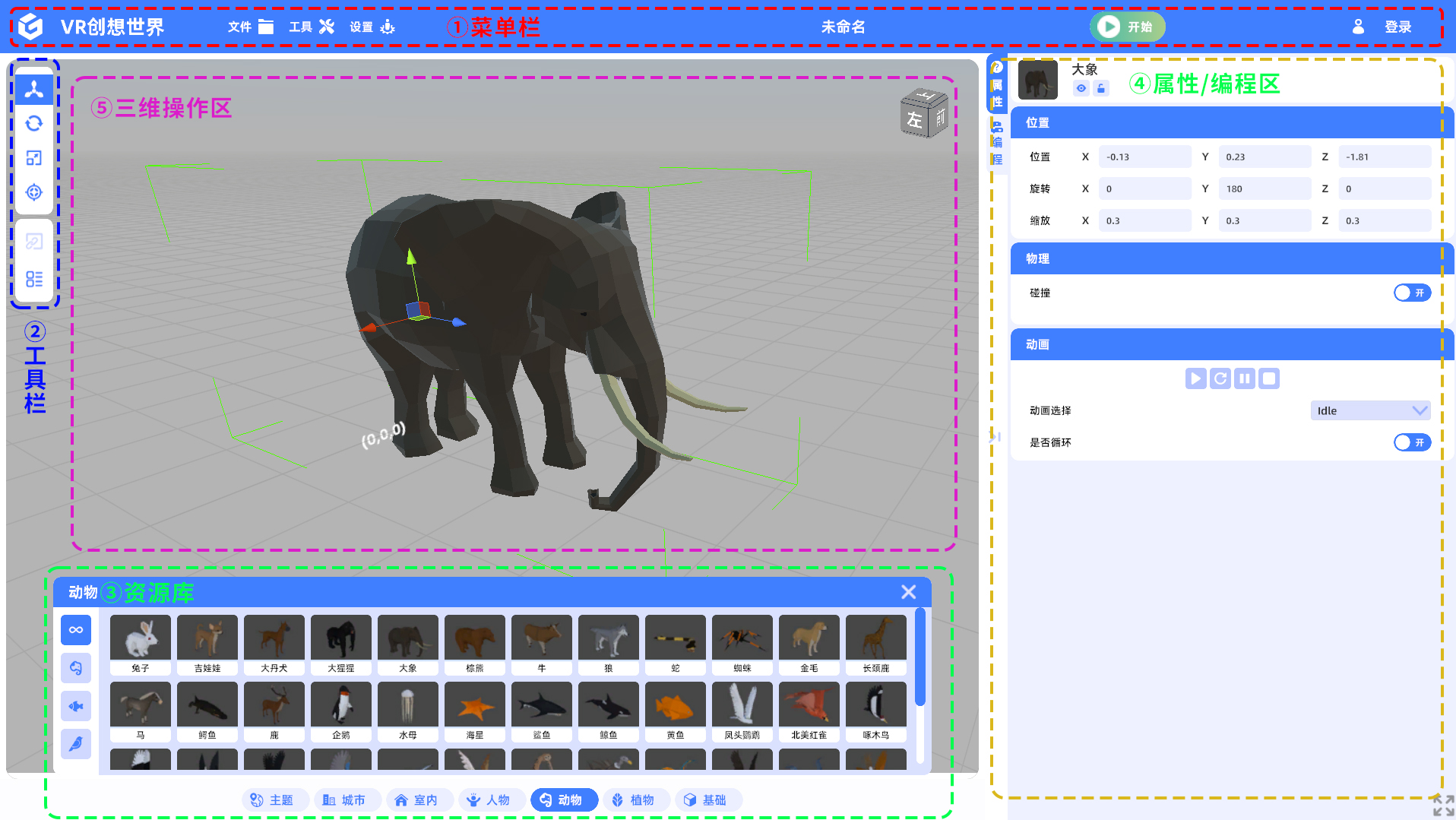 VR创想世界界面由菜单栏、工具栏、资源栏、属性、编程区、三维操作区组成。